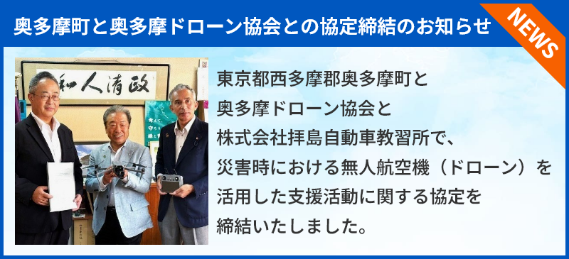 ドローンスクール東京都公安委員会指定・東京労働局長登録・国土交通大臣認定・国土交通省登録等、各省庁からの監督監査を受け、長年に渡って健全経営を行って来た拝島自動車教習所が運営する拝島ドローンスクール。