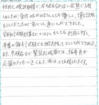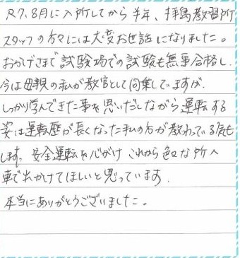 卒業までありがとうございました。バイト先が近くにあり、教習所とバイト先を行ったり来たりする日々を過ごしていました。嫌な人や感じの悪い人など1人もいなくて、とても良かったし、楽しく通うことができました。受付の人は、分からないことを優しく教えて下さり、教習官の方は、私が出来ないこと苦手なことを見つけだし、丁寧に教えてくれて、たくさんほめてくれたので、自信もつきました。スマホでムサシをやって、90点以上安定してとれていたのですが、それでも心配で発表が終わるまでドキドキでした。家に帰ったらすぐに両親や親せきに報告しました。拝島教習所のおかげで車の運転が好きになれたので、1人で好きな時に車に乗れることがとても楽しみですし、友達とドライブの予定も立てたいです!!安全運転を心がけて、無事故無違反目指します!!本当にありがとうございました。