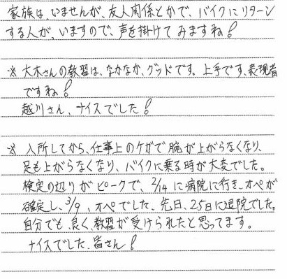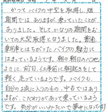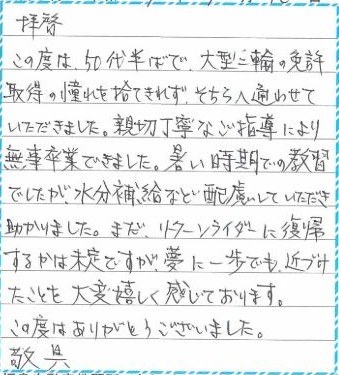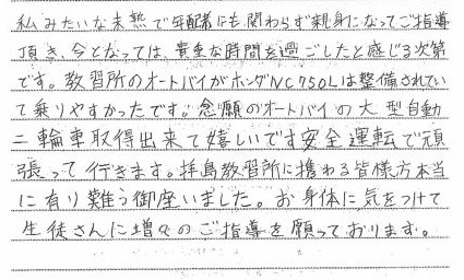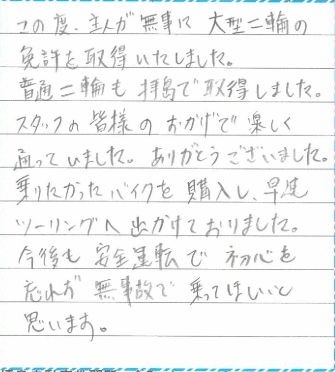 夫がバイクを購入し熱心に手入れや走る喜びを間近で見ていて息子自身も刺激を受け免許を取得し親子でツーリングに行く事を思い、教習所に通い始めました。教習所では同級生がスタッフとして働いていた事にビックリした!と言っていました。担当として教習もしていただいたそうです。教習所内のコースで教習中バイクが故障してしまうハプニングがあったりどしゃぶりの雨の中での教習があったりと、それも良き思い出となったようです。早々とヘルメットやジャケットを購入し卒検も合格し免許取得できました。喜びもひとしおの様子でした。これからも、夫、息子共に安全運転を心掛け、、限ずルールを守って欲しいと思います。(ツーリングはまだ先になるようですが…)教習所では親切なスタッフの皆様の熱意に感謝致します。