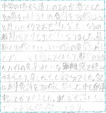 僕は元々自動車が好きで、入校できる歳になったらすぐに行きたいと思い入校させていただきました。自宅から自転車で行けるため非常に通いやすかったです。ずっと憧れていた3ペダル(MT)車で教習を受けさせていただきました。MT車の操作で苦戦することはありませんでしたが、横断歩道の歩行者を見落としてしまったり、うまく車幅間隔がとれなかったり、注意力が低く何度も指導員の方にブレーキを踏まれてしまい1日中落ち込んでしまったこともありました。そこからは自分の中での意識を変えたり先生のアドバイスを実践したりして本免許まで行くことができました。免許取得後は別の教習所を卒業した友人を府中試験場まで送ったり、山梨まで長距離運転したり充実した運転ライフを送っています。拝島教習所の皆様には本当にお世話になりました。先生方からいただいたアドバイスを忘れず無事故無違反を心がけたいと思います。