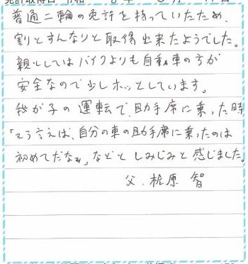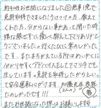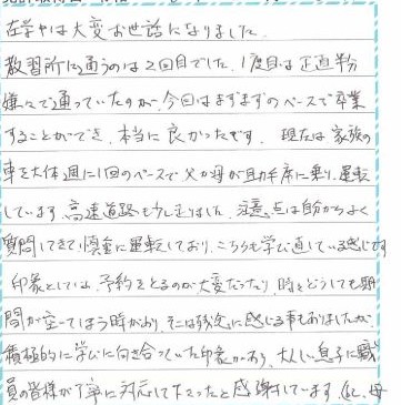 教習所に通うのは2回目でした。1度目は正直半分嫌々で通っていたのが、今回はまずまずのペースで卒業することができ、本当に良かったです。現在は、家族の車を大体週に1回のペースで、父か母が助手席に乗り、運転しています。高速道路も少し走りました。注意点は自分からよく質問してきて、慎重に運転しており、こちらも学び直している感じです。印象としては、予約をとるのが大変だったり、時々どうしても期間が空いてしまう時があり、そこは残念に感じる事もありましたが、積極的に学びに向き合っていた印象があり、大人しい息子に職員の皆様が丁寧に対応して下さったと感謝しています。(記.母)